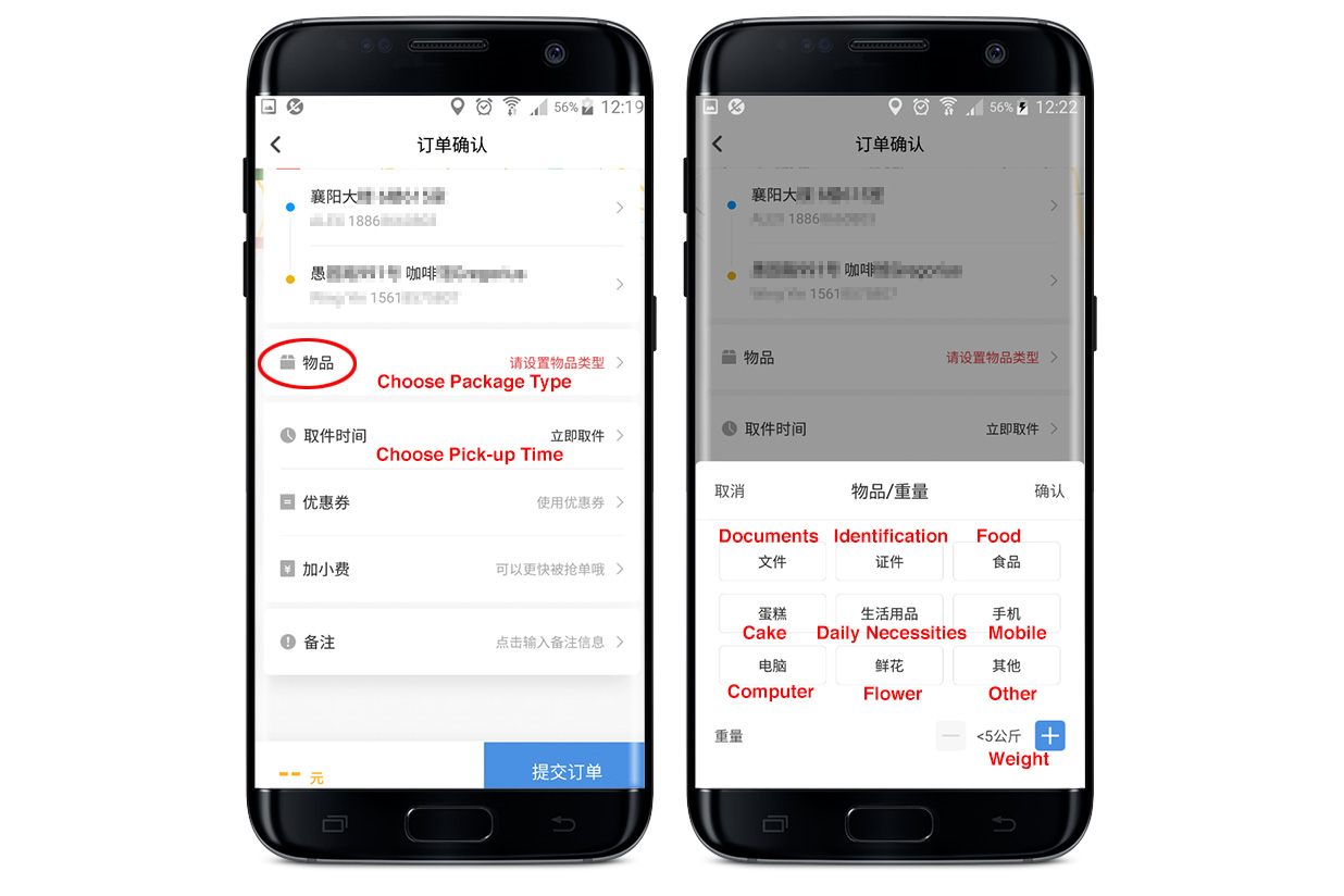 Inputting the info is straightforward: name, phone number, pick-up address (you can hit the icon to the right to choose locations close to you if your Location Sharing is on). Then recipient's name, phone number and delivery address (odd feature, it'll correct your selected district if the street you input isn't in that district. If it already knows, why make you select it?).